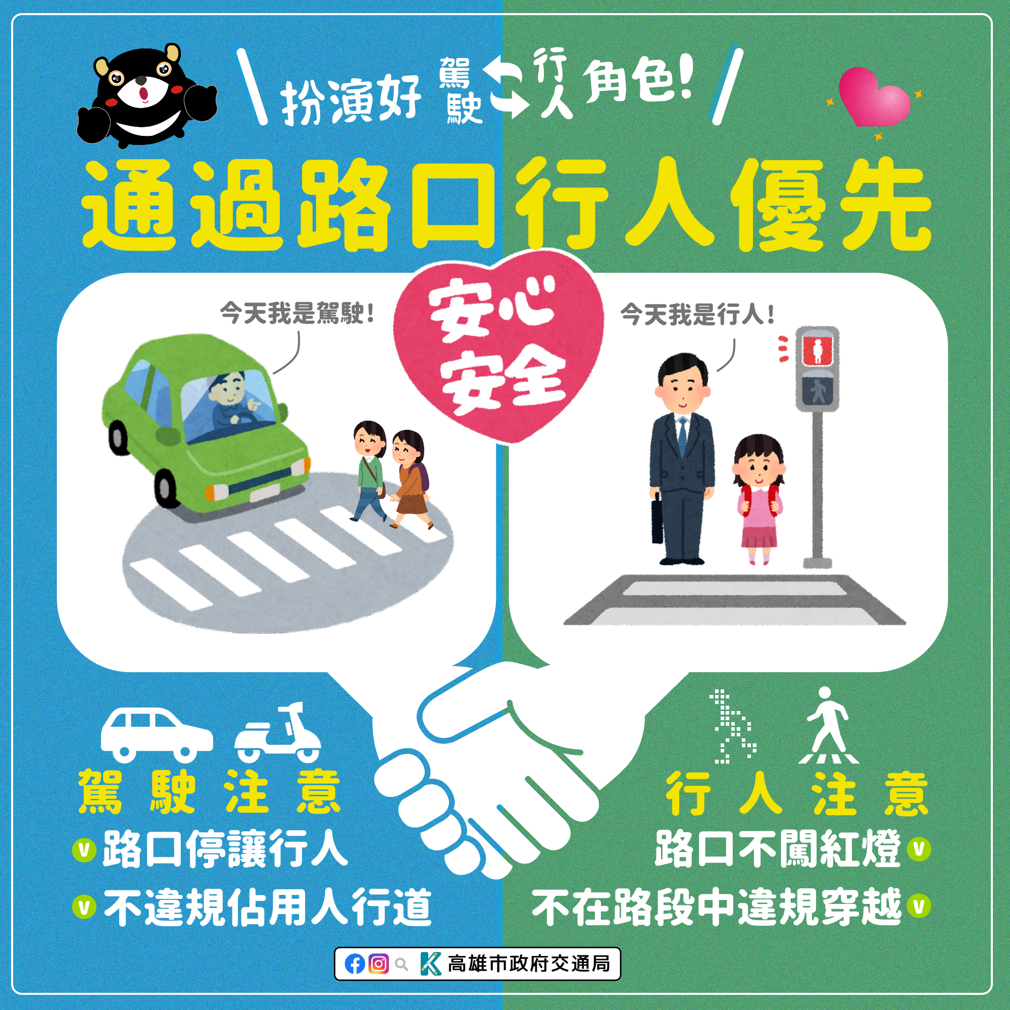 =================== >>🚶>>行人 ✅#路口不闖紅燈 ✅#不在路段中違規穿越 >>🚗>>車輛駕駛 ✅#路口停讓行人 🛑 ✅#不違規占用人行道 🙅♂️ =================== #高雄交通安全新文化